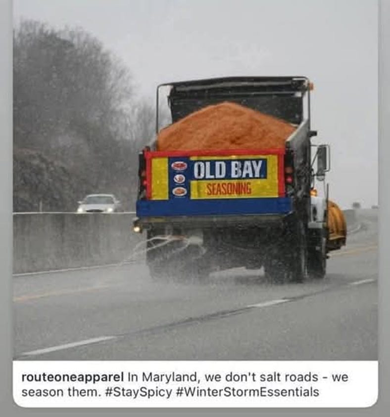 My first one comes from a long line of road salting crews finding and having fun with their spreader trucks. This spreader-truck Maryland, a state known for its seafood, decided to make a sort of inside joke. I mean I get it, but it probably hits a little harder for Maryland residents than it does for me.