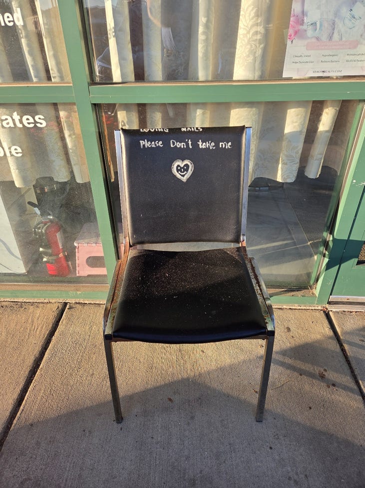 The final one for today comes from outside a little donut store in Kernersville, NC. I was walking in and noticed a couple chairs in front of the nail shop next door. There were three and they all had the same little message playfully written on them. A clever and fun way to secure the chairs and without all the weight of a chain and lock.